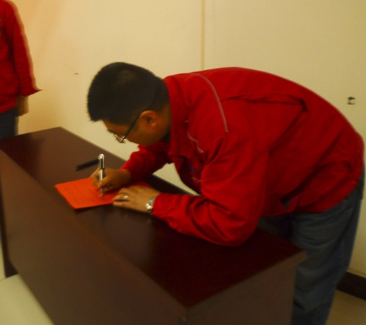 動(dòng)員大會(huì)上各級(jí)領(lǐng)導(dǎo)、各車間管理干部、車間班組長(zhǎng)上臺(tái)進(jìn)行“百日安全大練兵”活動(dòng)簽字儀式。